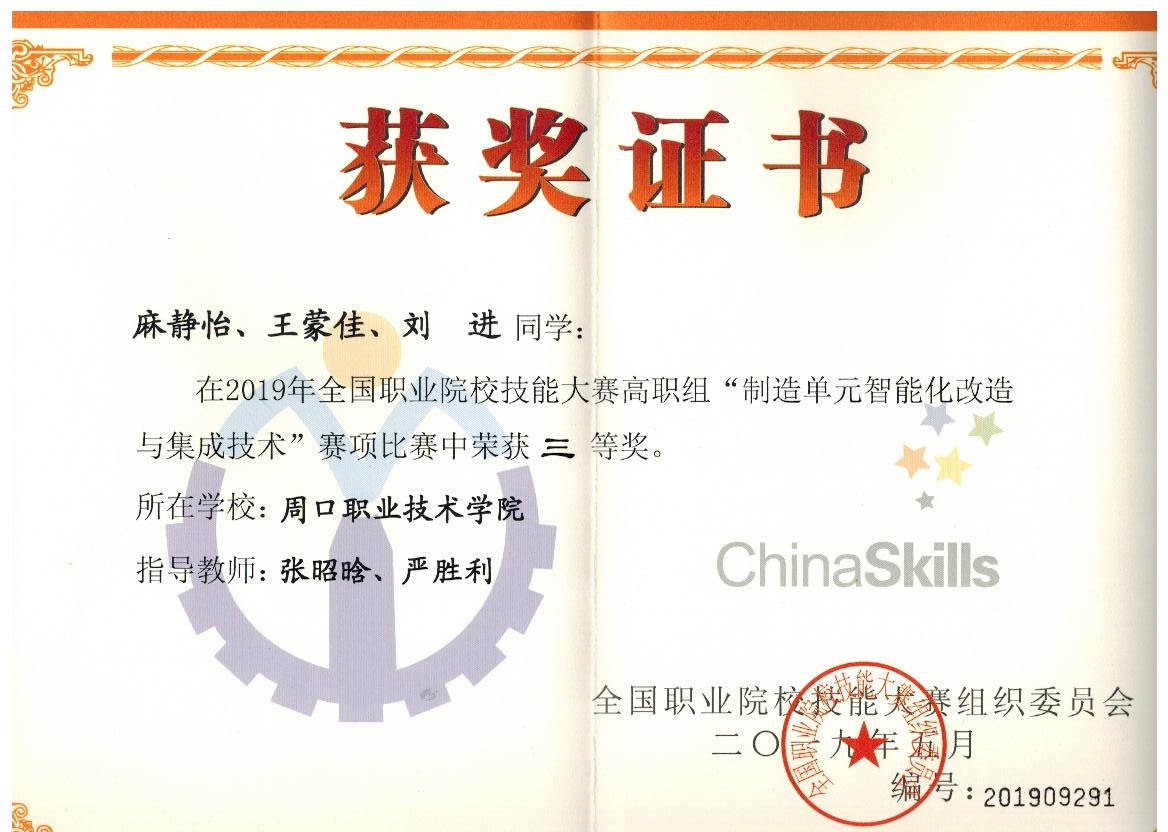 2019年6月2日,第十二届全国职业院校技能大赛成绩揭晓,WilliamHill官方网站参赛队再创佳绩,麻静怡,王蒙佳,刘进三名学生,在严胜利院长和张昭晗老师的精心指导下,代表河南省参加的“制造单元智能化改造与集成技术”项目,获得国赛三等奖。