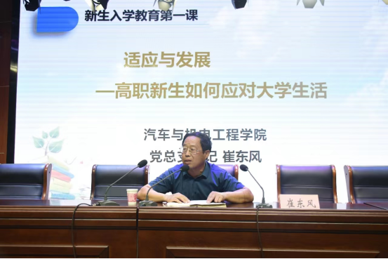 最后,崔东风书记为2023级新生上了入学教育第一课——《适应与发展-高职新生如何应对大学生活》。崔书记就学生如何应对大学生、度过大学时光;如何做职业规划和确定职业方向及能力;如何系统的学习专业知识;遇到困难如何克服和解决;如何专升本等几个方面进行讲解。同时围绕理想信念、团结互助和诚实守信等方面对同学们进行思想教育;要求同学们行胜于言,培养求真务实,脚踏实地的作风,增强责任意识。