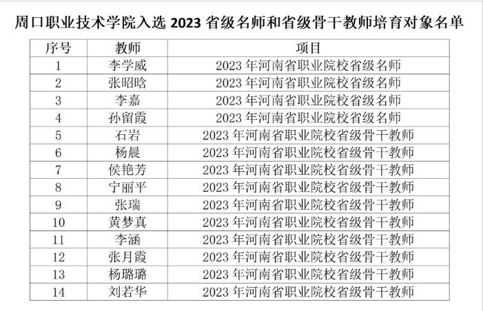 近日,河南省教育厅发布《关于2023年河南省职业院校省级名师和省级骨干教师培育对象评审结果的公示》,WilliamHill官网共有14名教师入选,其中WilliamHill官方网站张昭晗老师入选省级名师培育对象,张月霞、黄梦真老师入选省级骨干教师培育对象。