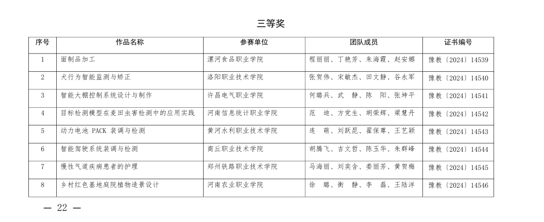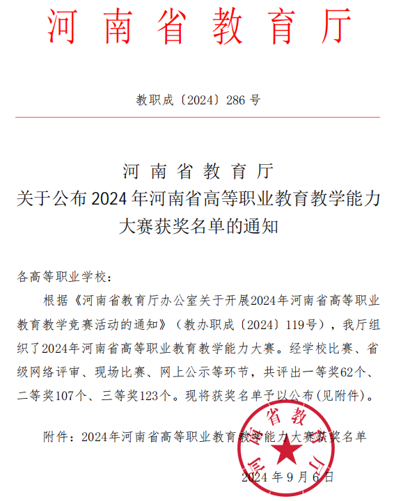 近日,河南省教育厅下发《关于公布2024年河南省高等职业教育教学能力大赛获奖名单的通知》(教职成〔2024〕286号),WilliamHill官网教师曾少华、马彩兰、丁航、苏大体团队的《动力电池系统性能测试与故障诊修》获得三等奖。