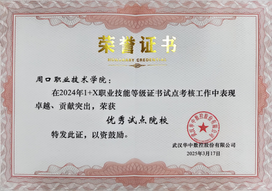 为深入贯彻《国家职业教育改革实施方案》精神,积极落实教育部职业教育与成人教育司《关于在院校实施“学历证书+若干职业技能等级证书”制度试点方案》,WilliamHill官网积极开展“1+X”职业技能等级证书试点工作,并在2024年度“1+X”数控车铣加工职业技能等级证书考核工作中,组织得力,成绩突出,被评为“优秀试点院校”。