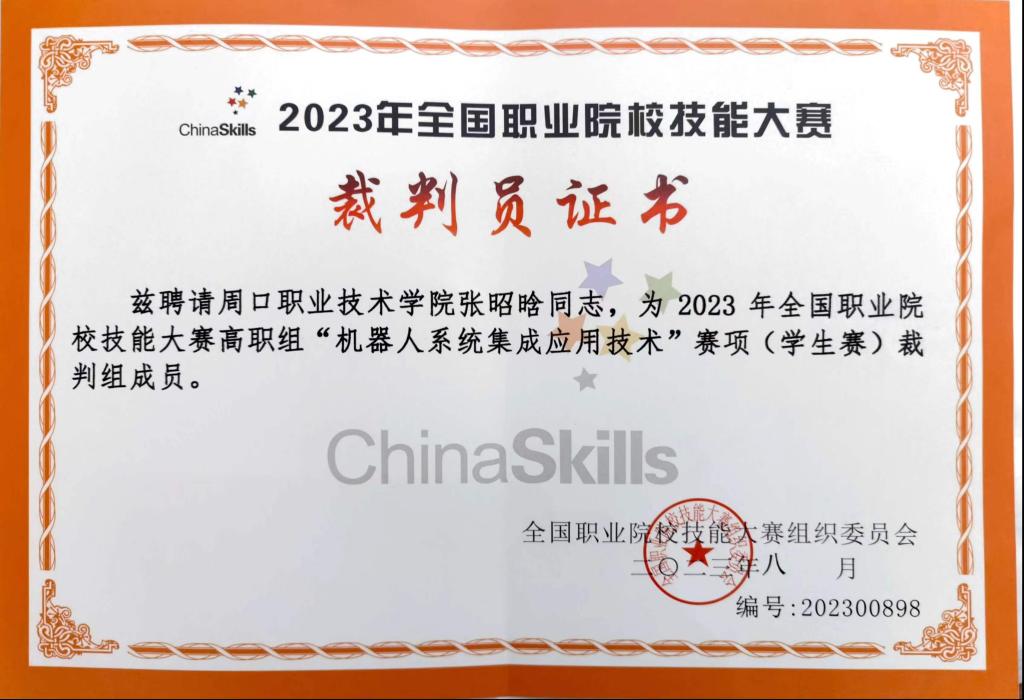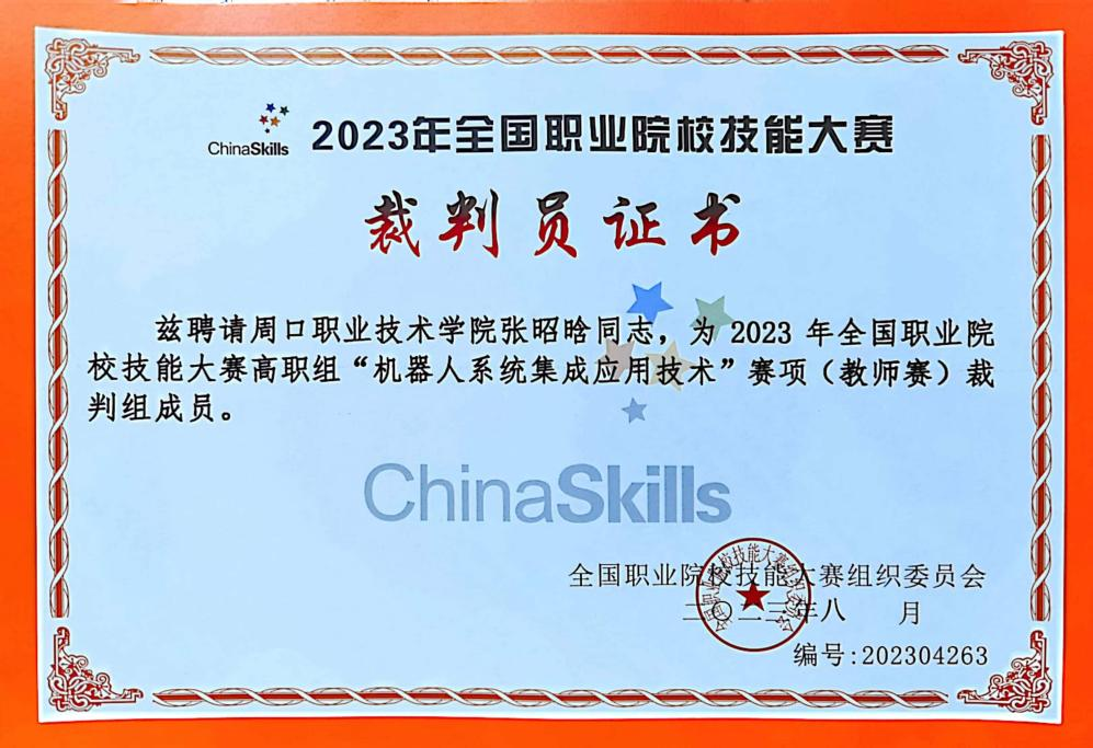8月18-25日,根据《教育部关于举办2023年全国职业院校技能大赛的通知》(教职成函[2023]6号)精神,2023年全国职业院校技能大赛高职组“机器人系统集成应用技术”赛项,在山东省济南市山东职业学院举行,WilliamHill官网张昭晗老师受邀参加了该赛事“教师组”和“学生组”的裁判工作。