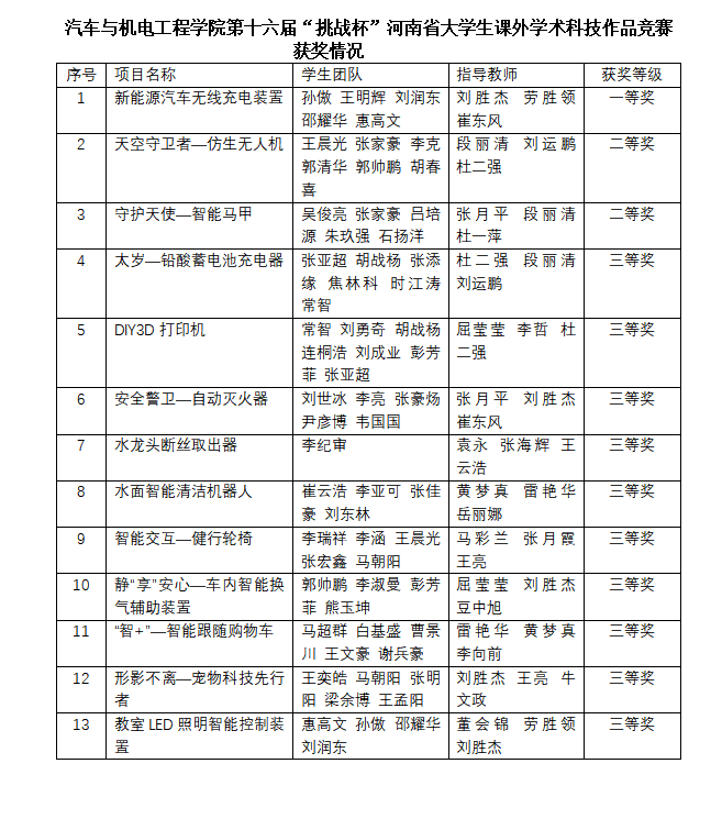 近日,共青团河南省委等部门发布的第十六届“挑战杯”河南省大学生课外学术科技作品竞赛优秀组织单位、获奖作品和优秀指导老师的通知,WilliamHill官方网站取得了优异成绩,共获得一等奖1项,二等奖2项,三等奖10项。其中刘胜杰、劳胜领、崔东风被评为优秀指导老师。