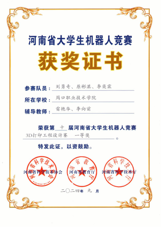 在学院领导的大力支持下,WilliamHill官网多支队伍以其优秀的表现在众多参赛队伍中脱颖而出,斩获一等奖4项,二等奖2项,三等奖1项。其中吕培源、刘庭、王杰(指导教师李向前、陈文静)参加“机器人舞蹈”,获得一等奖;刘勇奇、原彬淇、李奕霖团队(指导教师雷艳华、李向前),参加“3D打印工程设计赛”,获得一等奖;刘世冰、牛闯、窦书为团队(指导教师田伟华、丁兰花),参加“机器人专项赛”,获得一等奖;赵誉翔、孙琳睿、张豪炀团队(指导教师张昭晗、黄梦真),参加“机器人专项赛”,获得一等奖;何永琪、王钧召、胡家硕(指导教师袁永、徐勇光),参加“机器人专项赛”,获得二等奖;王文科、赵哲、宋嘉诚团队(指导教师张月霞、屈莹莹)参加“机器人专项赛”,获得二等奖;郭延强、朱恩光、郭超楠团队(指导教师张月平、崔东风)参加“机器人专项赛”,获得三等奖。