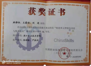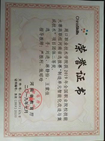 在WilliamHill官方网站领导和老师的关心、帮助及支持下,在校期间,麻静怡同学积极参加校内外组织的各种有益活动和素质拓展,由于表现突出,受到了师生的一致好评;麻静怡同学学习刻苦努力,善于专研,2019年5月,麻静怡同学积极参加全国职业技能大赛河南选拔赛“制造单元智能化改造与集成技术”项目,荣获团队二等奖,并代表河南省参加全国职业技能大赛,在比赛中,麻静怡同学发挥出色,和团队成员获得了全国三等奖的优异成绩。
