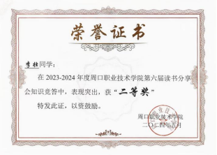 自入学以来,李壮同学在学习上始终保持着高度的自律和刻苦精神。课堂上,他全神贯注,认真聆听老师的每一句话,积极思考,踊跃回答问题;同时,在课下李壮同学积极学习专业技能知识,通过实操来锻炼自己的操作能力,李壮同学的成绩在班级和年级中始终名列前茅,在2024年度被评为周口职业技术“三好学生” ,同时在2023-2024学年荣获国家励志奖学金。同时李壮同学积极参与创新创业大赛,通过自身的努力以及团队的协作,在2024年河南省大学生创新大赛暨中国国际大学生创新大赛河南赛区选拔赛中,荣获三等奖。
