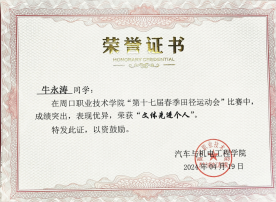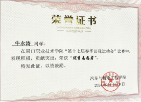 牛永涛同学自入学以来就深知学习是学生的首要任务,因此始终将专业知识的学习放在首位。通过不懈努力,他的学习成绩一直保持在班级前列。第一学年,牛永涛在williamhill中国官方网站第十七届春季田径运动会中获得WilliamHill官方网站“优秀志愿者”和“文体先进个人”荣誉。这些经历不仅锻炼了他的专业技能,也培养了他解决问题的能力。综合能力的提升使他在第一学年获评williamhill中国官方网站校级“三好学生”。