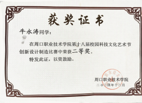 在追求学术卓越的同时,牛永涛同学也注重个人品德修养的提升。他担任班级团支书,尊敬师长,团结同学,耐心帮助同学们解决各种困难;同时担任院级学生会干部,认真配合老师工作,积极参与学校组织的各项活动,努力践行社会主义核心价值观。此外,牛永涛在课余时间积极参加学校组织的科技文化节活动,在williamhill中国官方网站第十八届科技文化节创新设计制造比赛中表现优异,荣获二等奖。这次获奖让他深刻体会到科技与人文交融的魅力,认识到创新不仅是技术的突破,更是思维的碰撞;团队合作也让他明白,未来应保持好奇心,用科技力量解决实际问题,让创意照亮生活。