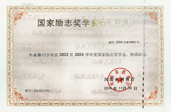 作为新时代的大学生,牛永涛同学不仅扎实学好专业知识,更具备良好的道德品质和社会责任感,并于2023-2024学年荣获国家励志奖学金。获得这份荣誉,牛永涛深感荣幸,也深知责任重大。这不仅是对他过去努力的肯定,更是对未来的激励。他明白这份荣誉背后饱含着国家的关怀与师长的栽培,因此更加珍惜学习机会。作为受益者,他决心以感恩之心回报社会,刻苦钻研,提升自我,将来为国家发展贡献力量。同时,他也希望将这份温暖传递下去,帮助更多有需要的人,让励志精神薪火相传。