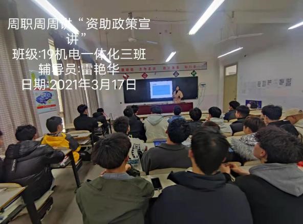 为让广大学生了解和掌握国家资助政策,2021年3月8日-3月12日,按照学校学生处要求WilliamHill官网组织学生召开“奋进新时代,周职周周讲”第四十六期——“资助政策宣讲”主题班会。