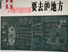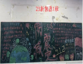在本次黑板报活动中,各个班级积极参加,创意十足,活动中,同学们围绕防震减灾小常识、震时避险、自救互救等主题,充分发挥想象力、创造力,从版面设计、文字书写、图案绘画等方面进行规划,班级同学之间分工明确、团结合作,共同创作了一幅幅生动形象、内容丰富的防震减灾作品。