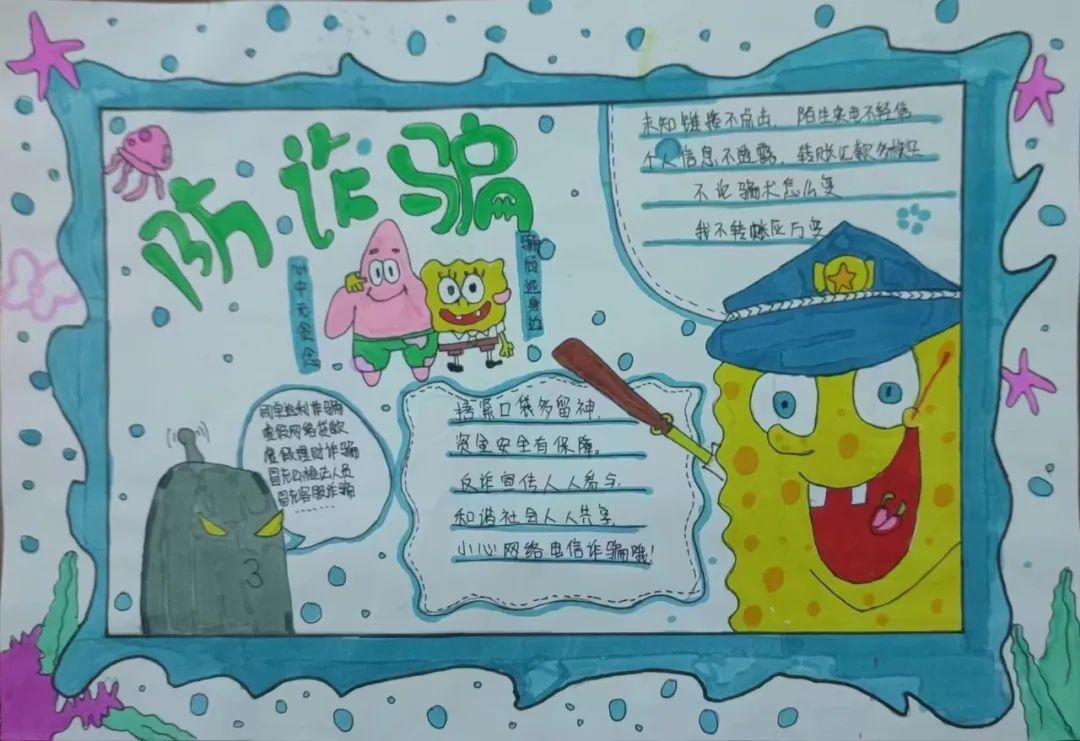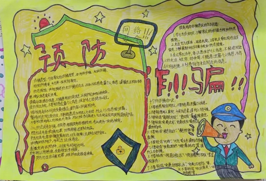 活动期间,各班级的同学们踊跃参与,紧紧围绕学校、社会、生活中容易出现的一系列诈骗形式,精心设计,大胆想象,以独特的视角精心创作出一幅幅内容丰富、形式多样、寓意深刻的手抄报,实现了学生由被动接受宣传向主动担负反诈宣传任务的转变,构筑起学生团体坚实的思想防线。