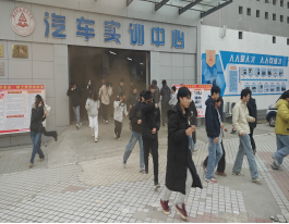 演练开始,模拟汽车实训室内出现“火情”,浓烟弥漫。随着警报声响起,学生们在辅导员的指挥下,迅速按照应急方案,捂住口鼻,弯腰低姿,沿着指定疏散通道快速、有序地撤离至室外安全地带,整个过程紧张高效,井然有序。