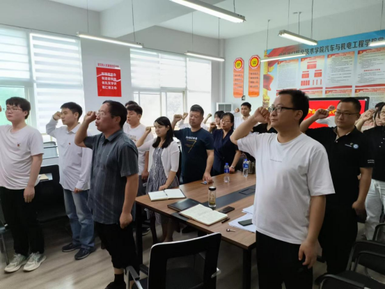 最后,汽车与机电工程学院党总支书记崔东风进行了党课教育,希望大家在今后的学习、工作、生活中能够不忘入党初心,坚定理想信念,加强党性修养,提高自身学习能力,发挥党员的模范带头作用。并带领新进党员进行宣誓。