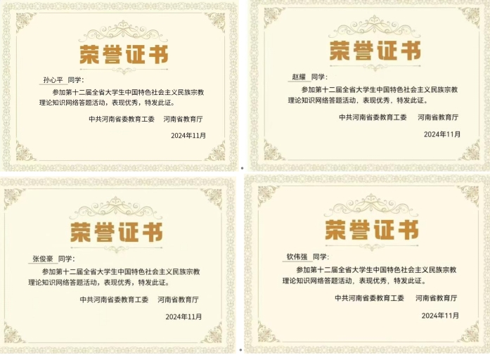 活动以网络答题为载体,内容涵盖民族政策法规、宗教基础知识、民族团结进步创建等多个方面,旨在通过答题形式,检验和巩固学生们的学习成果,增强其对民族宗教问题的敏感性和鉴别力。活动得到了广大学生的积极响应,参与人数众多,大家纷纷利用课余时间认真学习相关资料,积极参与在线答题,在学院内营造了浓厚的学习氛围。许多同学凭借对知识点的精准掌握和出色的答题表现,荣获此次答题竞赛证书,这些获奖学生在学习过程中展现出了强烈的求知欲和严谨的学习态度,不仅为自己赢得了荣誉,更为全院同学树立了榜样。